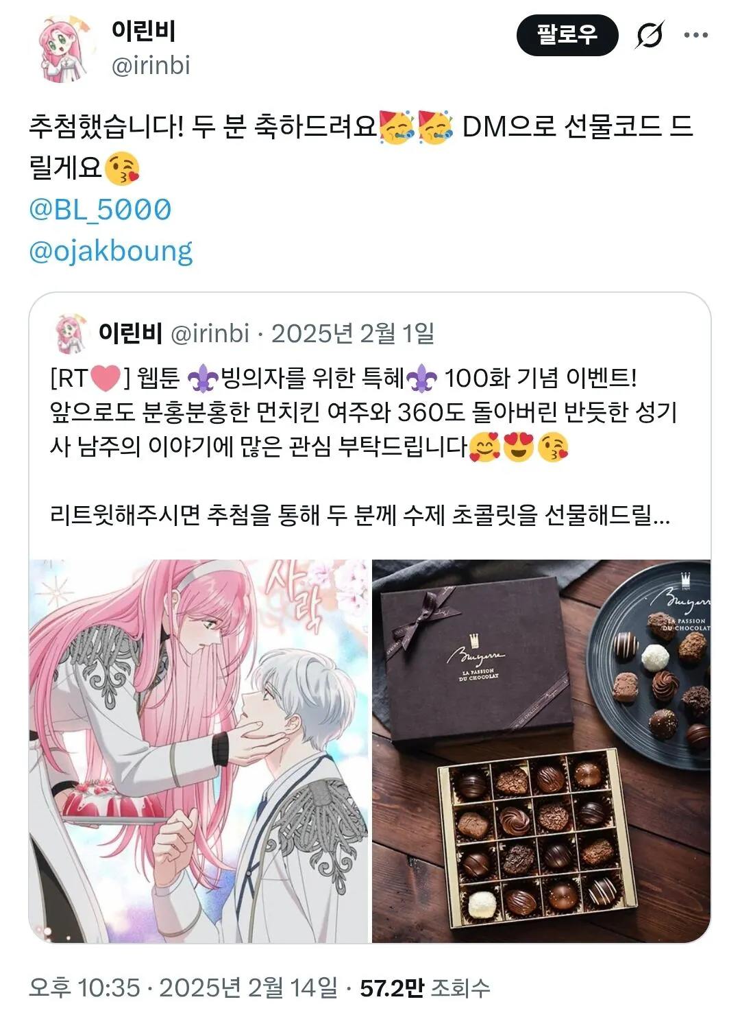 로판 작가가 웹툰화 100화 도달 축하로 이벤트를 진행했대당첨된 독자가 좋아하며 반응했는데 정체를 알아보니 불법 도용 사이트에서만 작품을 보던 사람이었다고 함결국 해당 이용자를 차단 처리했다는 후문