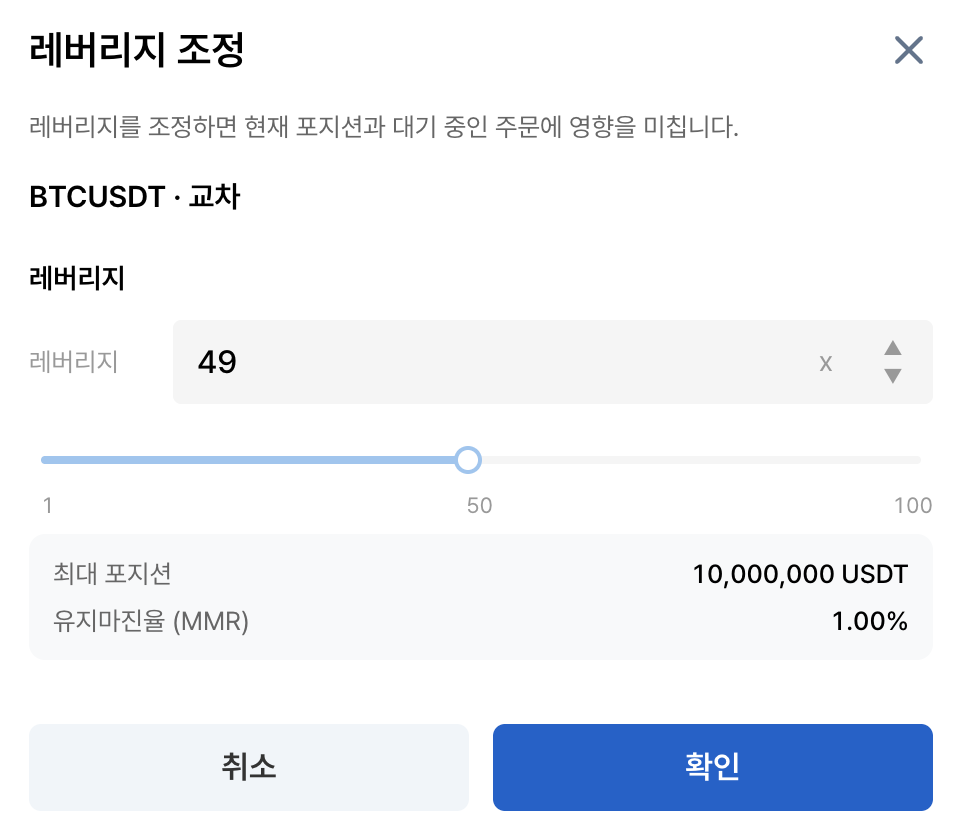 ⚠️ 유지마진율이 100%에 도달하면 Cross 포지션 전체가 청산됩니다.