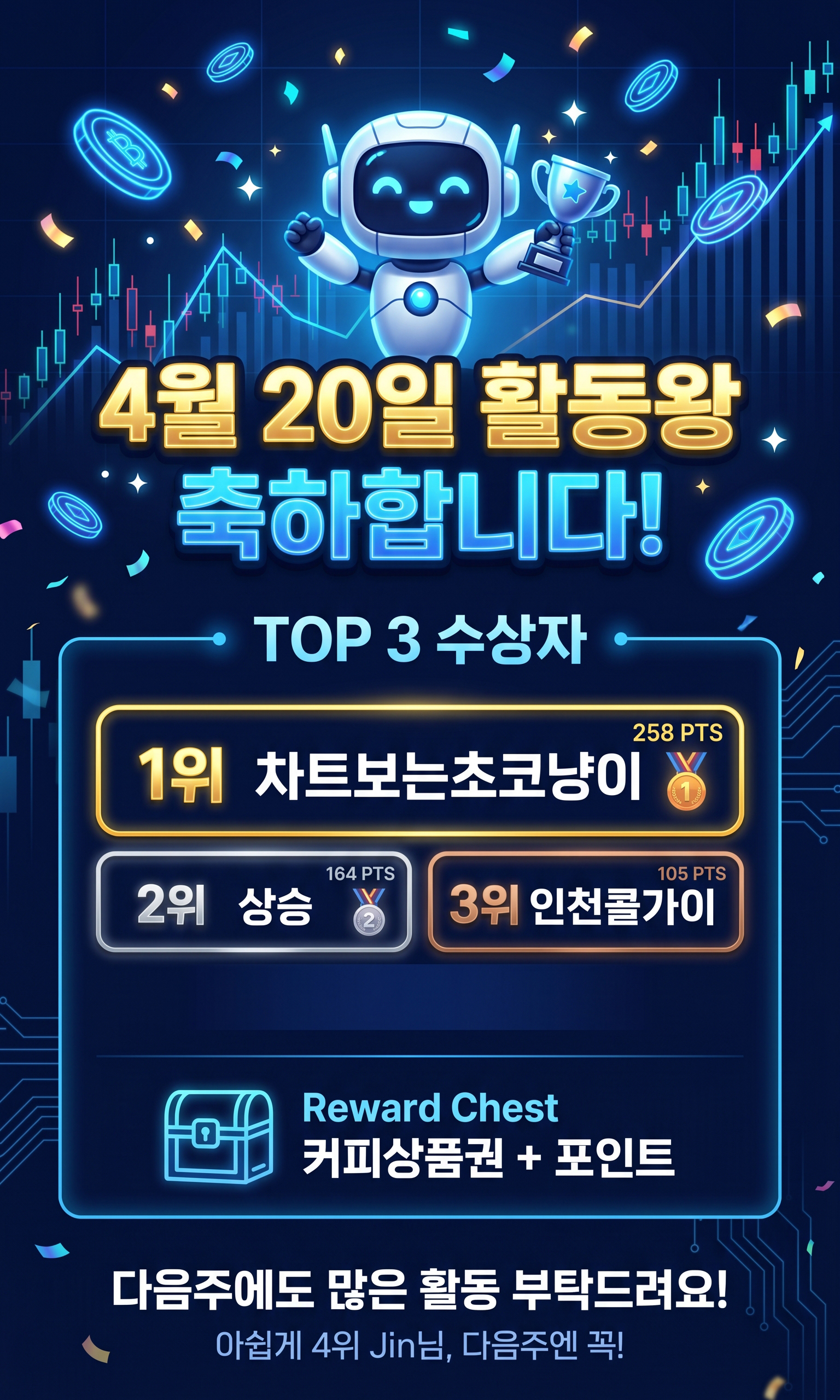 아... 한 끗 차이로 4위에 머무신 Jin님! 너무 아쉽습니다. 😭 하지만 실망은 금물! 지금의 기세를 몰아 다음 주에는 반드시 '활동왕' 타이틀과 함께 시상대 정중앙에 서시길 저희 모두가 응원하겠습니다! Jin님, 화이팅!